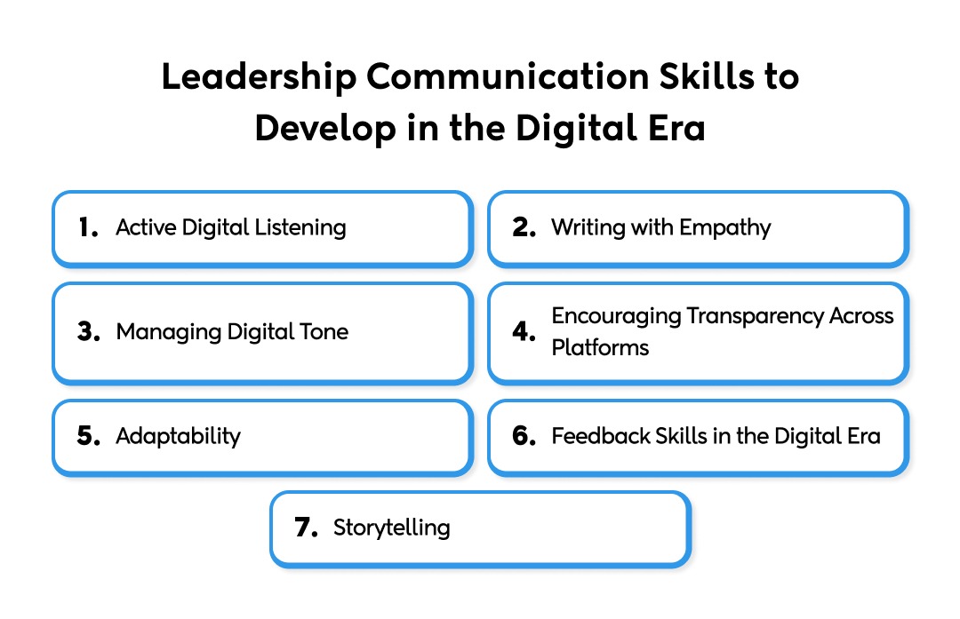 To lead effectively in this digital era, you must go beyond mastering tools. You need to refine communication skills that ensure clarity, connections, and trust. Express ideas clearly so your team understands your vision, listen actively to make the team feel heard, and show empathy to maintain human connection even through screens. Here are some essential skills to develop: